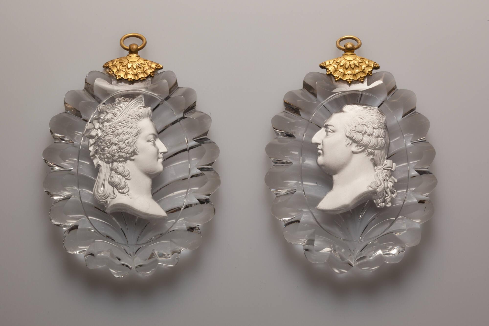 Label TextPopular during the late 18th and early 19th centuries, cameo incrustation, or “sulphide,” is achieved by encasing in molten glass a molded relief ornament made from a mix of clay and potash. This special ceramic does not melt or crack in the hot glass, but permanently fuses to it. The refraction of light through the lead glass lends the white cameos their distinct silver-metallic sheen—a clever and innovative optical illusion. These particular sulphides immortalize the profiles of Marie Antoinette and Louis XVI. Created decades after the French Revolution and the royal couple’s executions, such plaques likely would have been owned by French Royalists as commemorative wall decorations.Published ReferencesA Marriage of Collections: The Property of Dr. Julius And Dena K. Tarshis, Christie's Auction, New York, April 21, 2010, lot 44.
