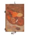 Red obi, black electric wires, orange flowers/ embossed sky, pale orange details