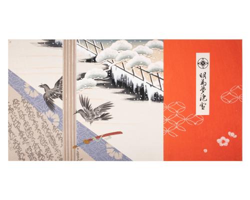 DescriptionSnow-covered pines, pair of black birds and dagger.