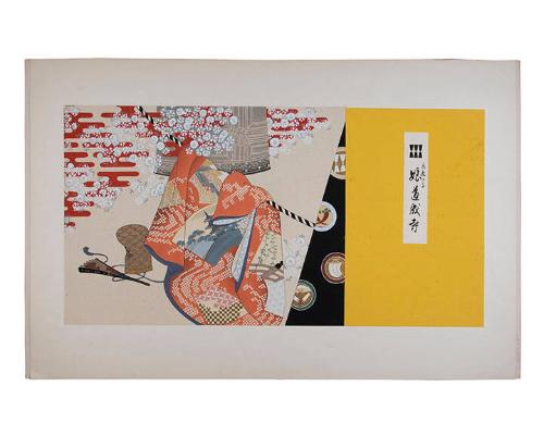DescriptionElaborate Robe, hat and fan with floral background and Bell?