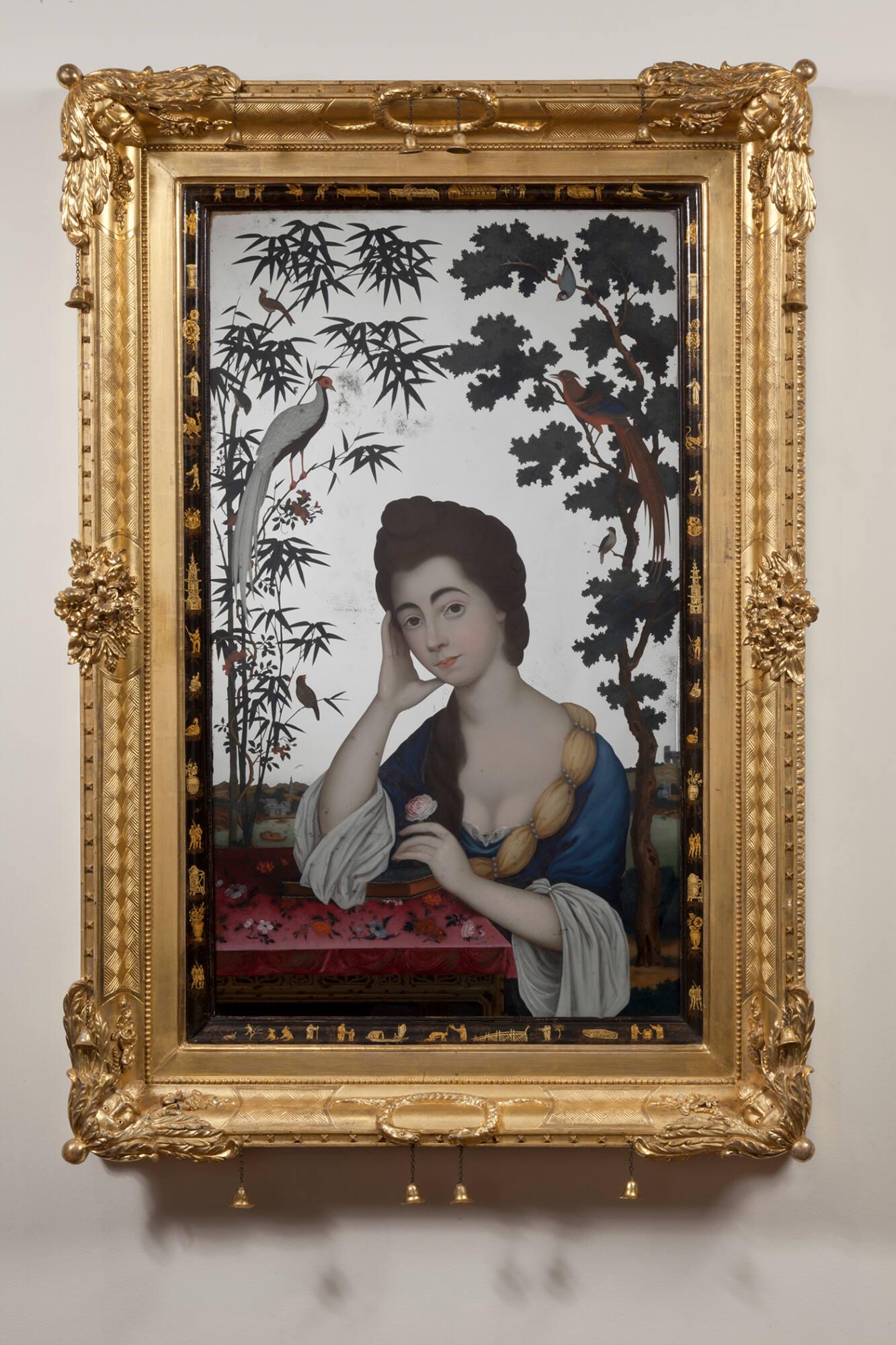 The mirrors portray the fraternal twins Elizabeth and Christian Graham in half length. Elizabeth is wearing a blue dress and is seated by a round, red-draped table with a basket of flowers, flanked by exotic birds in bamboo and a tree, a watery landscape beyond. The original Chinese frame with a black and gilt-japanned slip depicting Chinamen, buildings and utensils is retained within elaborate Regency frames of gilt wood and carton pierre, embellished with simulated basketwork bolection-molded outer part, the corners with a bearded mask amidst acanthus, the apron and cresting with entwined serpents and hung with bells.