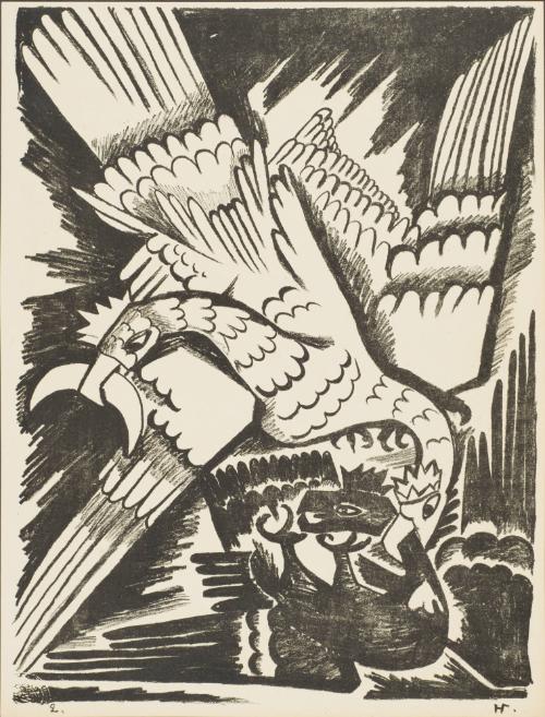 Label TextNatalia Goncharova created this album shortly after the outbreak of World War I in August 1914 and the dispatch of Mikhail Larionov, her companion, to the front. Inspired by Russian military successes at the beginning of the war and the upsurge of Russian patriotism, Goncharova presents war in apocalyptic and nationalistic terms as a divinely protected endeavor, guided by the interventions of heavenly angels and Russian saints. With charged references to icons and popular religious prints, she expresses her fears of war's devastation and her fervent hopes for Russia's victory.Exhibition HistoryToledo Museum of Art, Russian Books & Prints, Dec.19,1981-Feb.15,1982.