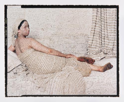 Label TextLalla Essaydi’s Grande Odalisque is part of her larger series Les Femmes du Maroc (Women of Morocco) responding to and countering the West’s perception of Arabic women through the lens of 19th-century Orientalism, in which European artists condescendingly treated Middle Eastern and North African cultures as passive, exotic, and “other.” This work takes direct inspiration from Neoclassical painter Jean August Dominique Ingres’ painting of an eroticized Near Eastern woman, La Grande Odalisque (1814). Instead of being fully nude, Essaydi’s figure is draped in white mourning fabric, and her gaze is more direct than inviting. Her skin is inscribed in henna with Arabic calligraphy. In the Islamic tradition, calligraphy is typically reserved for men, but henna is a form practiced by women. Further, Essaydi includes musings on personal freedom, identity, and memory from her own journals. She explains, “By reclaiming the rich tradition of calligraphy and interweaving it with the traditionally female art of henna, I have been able to express, and yet, in another sense, dissolve the contradictions I have encountered in my culture: between hierarchy and fluidity, between public and private space, between the richness and the confining aspects of Islamic traditions.” Essaydi employs beauty as a lure, which can reveal our complicity in perpetuating orientalist tropes. She says, “I invite viewers to resist stereotypes.”Published Referencesc.f. Essaydi, Lalla, Les Femmes du Maroc, Brooklyn, Powerhouse Books, 2009, p. 12, repr. pp. 27 and 90.