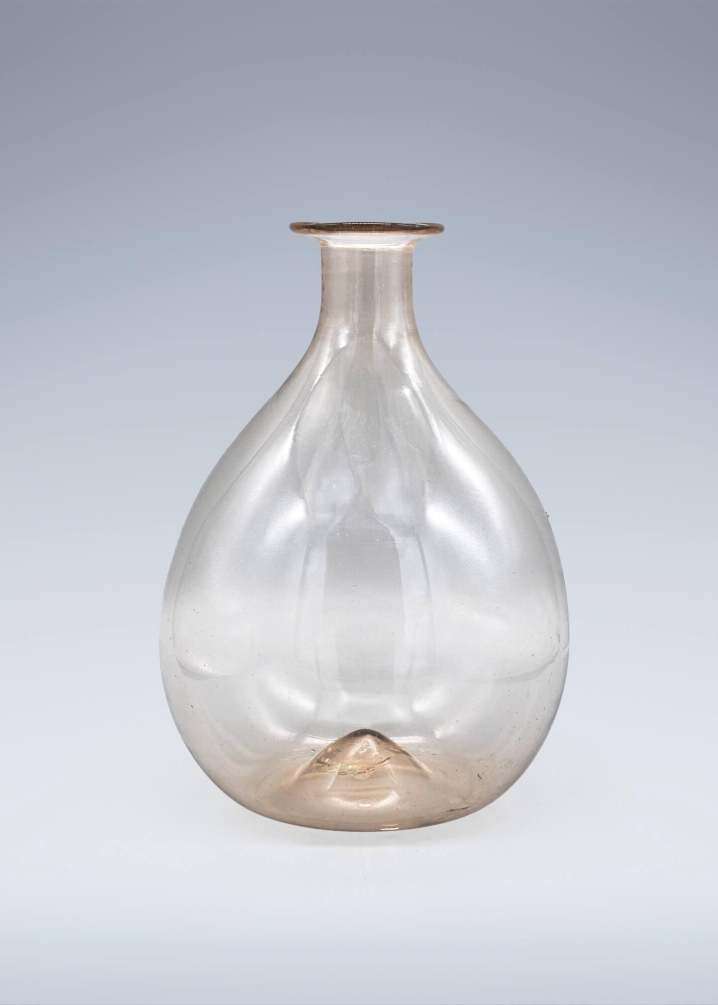 MediumTransparent soda-lime glass with light amber tinge; blown narrow neck, rim turned out, high kick
