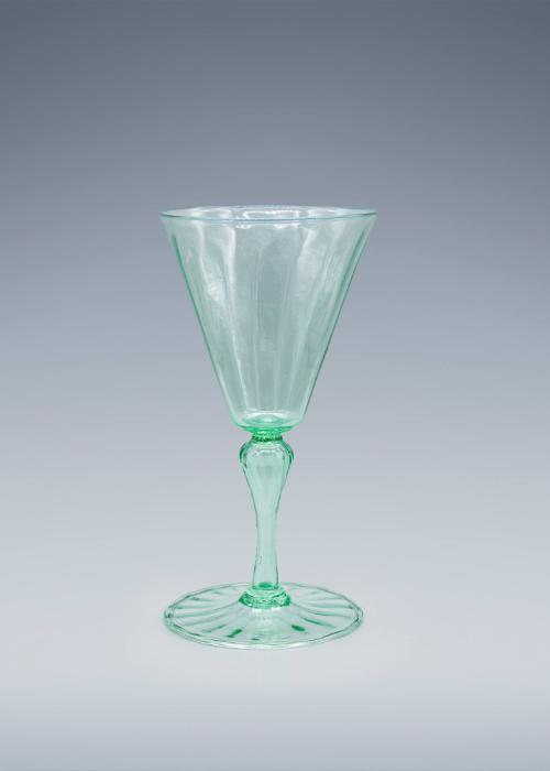 MediumTransparent green glass; blown in optic mold, conical bowl, ballister stem blown in optic mold, applied pedestal foot blown in optic mold with foot rim folded under.