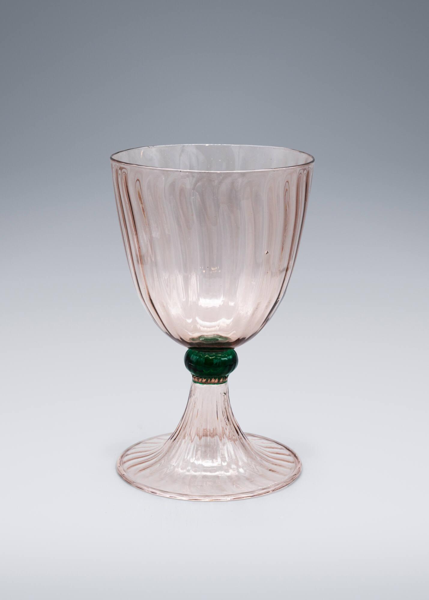 DescriptionTransparent glass with pink tinge, bowl blown in an optic mold, applied to translucent green knop, on a pedestal foot blown in optic mold with foot rim folded under.