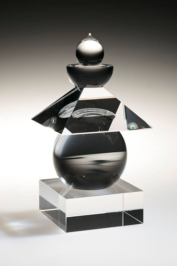 DescriptionCast glass sculpture consisting of five stacked geometric elements (bottom to top): a cube, a sphere with a black and white transparency of a seascape sandwiched vertically between its two hemispheres, a pyramidal shape, a hemisphere, and a drop-shaped element.