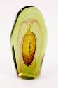 DescriptionSilver glass inner form and gold veiling encased in green glass. Large, oval, hollow, pontil mark, polished, surrounded by broad semi-polished flat.