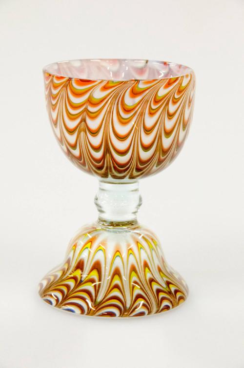DescriptionMulti-colored festoons on opaque white glass encased in colorless glass. Foot blown to match. Joined to bowl with colorless, tooled knop. Rough pontil mark.