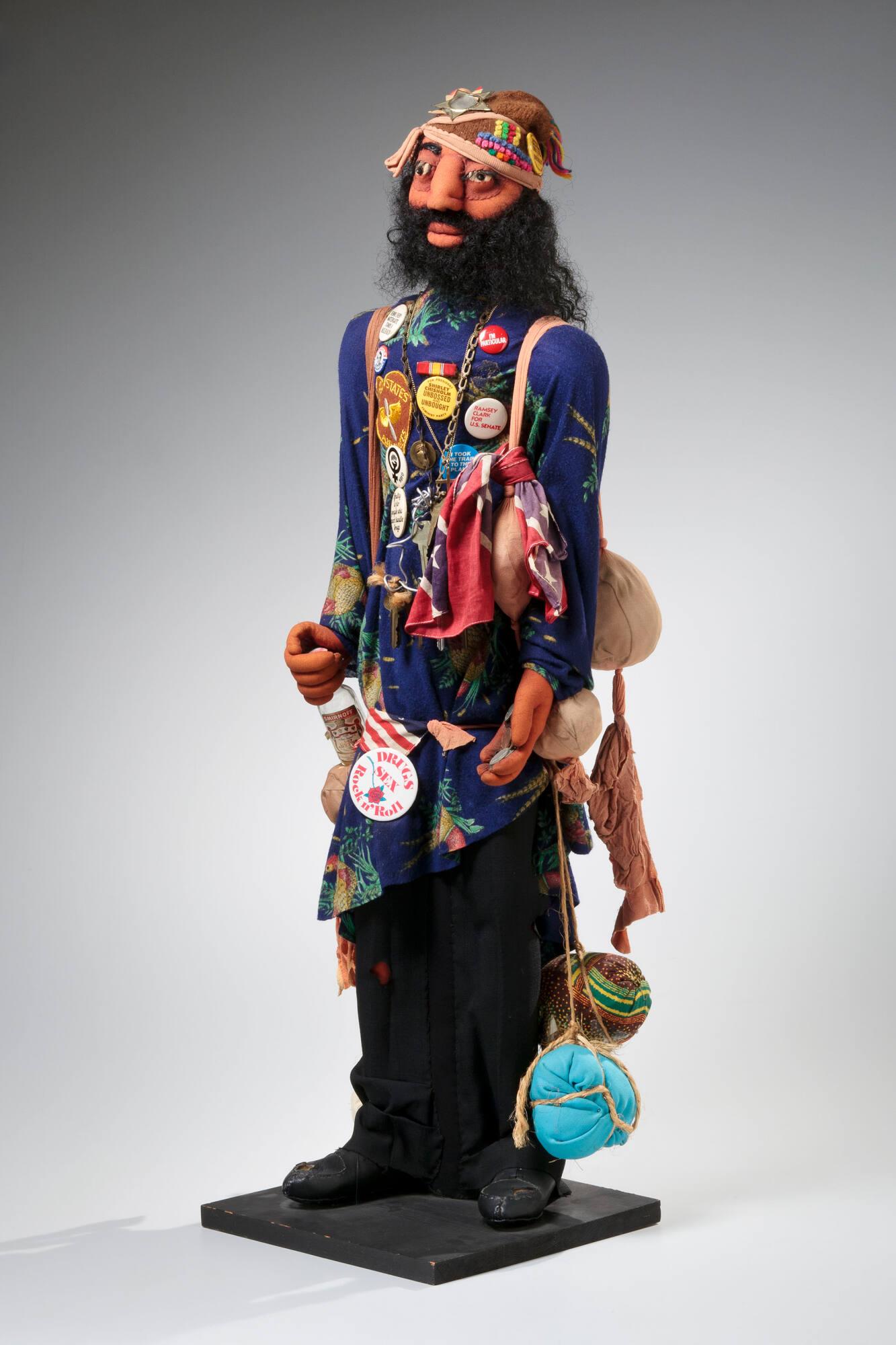 Label TextA precursor to her celebrated Story Quilts, Faith Ringgold’s soft sculptures are hand-stitched together, incorporating printed fabric and a patchwork of narrative details. In the soft sculpture Ben, racial and socioeconomic stereotypes abound. With tattered clothing, worn shoes, bags of belongings slung over his shoulders, an empty bottle of liquor, and pocket change in hand, we are to understand Ben as an unhoused man who embodies the turbulent atmosphere of the 1970s. Push-back buttons indicate progressive political views, Black feminist support, and countercultural values. The U.S. and Confederate flags are both tied to his body, though not in a reverential way. A United States Air Forces sweetheart patch (worn by civilians with loved ones who served in World War II) indicates that Ben is from a military family. To the right of this patch, a National Defense Service Medal Ribbon—given to those who actively served in Vietnam—strongly suggests that Ben is himself a veteran. He likely has not found the homecoming he was hoping for due to the disillusionment and anti-war sentiments of many Americans of the period, further complicated by the racism Black soldiers faced both on the frontlines and back at home. In response, he seems to have turned to reforming the political system through progressive action.Published ReferencesApplebaum, Lauren, Radical Tradition: American Quilts and Social Change, Toledo, Toledo Museum of Art, 2020, p. 23 [exh. catatlogue].Membership