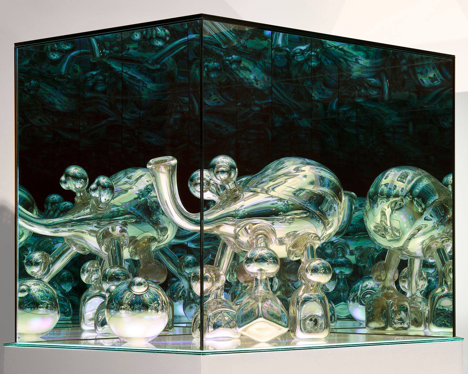 DescriptionBlown and mirrored glass, encased in a box constructed of two-way mirrors, with computer programmed colored LEDs.