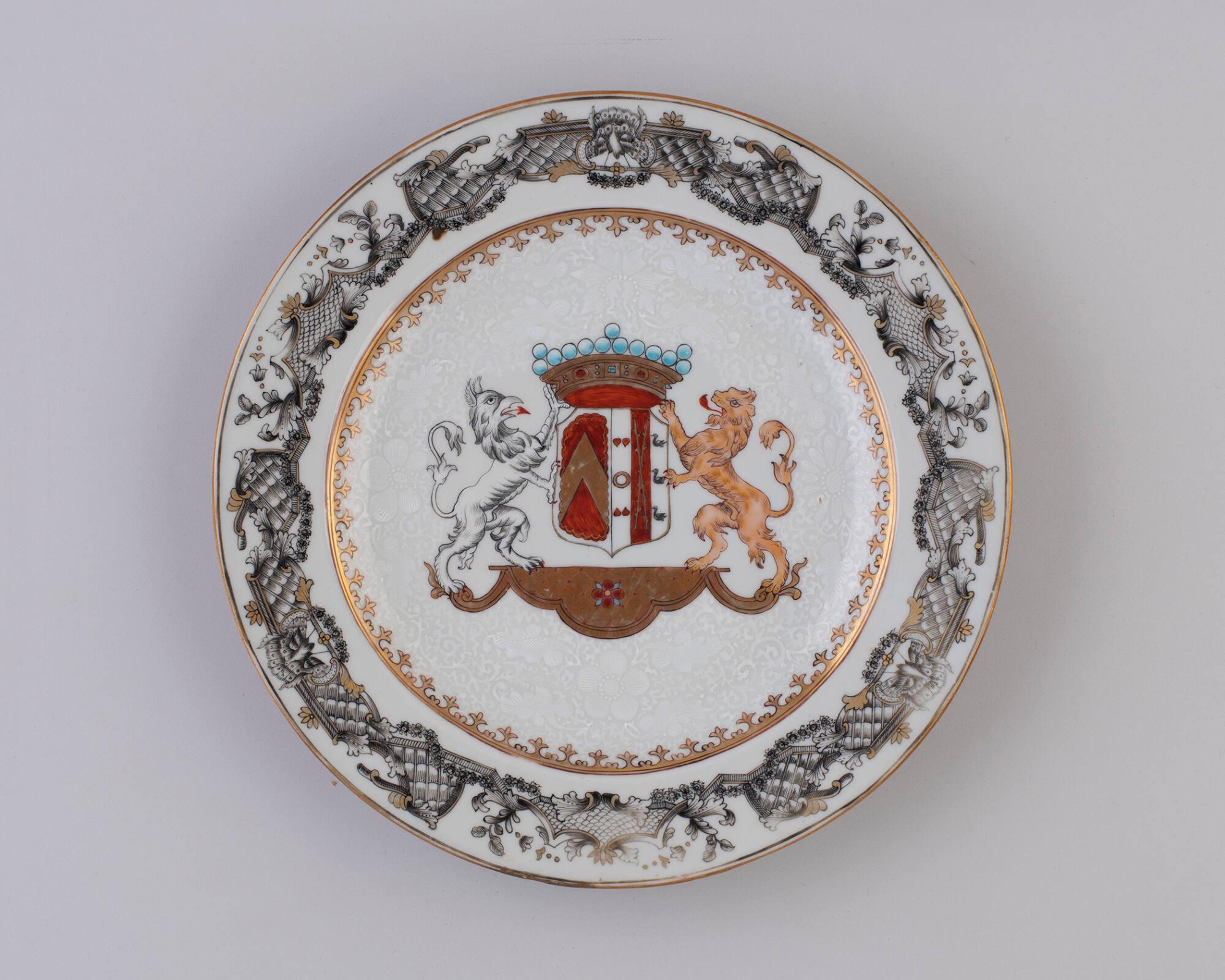 DescriptionCoat of arms with griffin and lion supports, Bianco sopra designs, border with designs en grisaille.