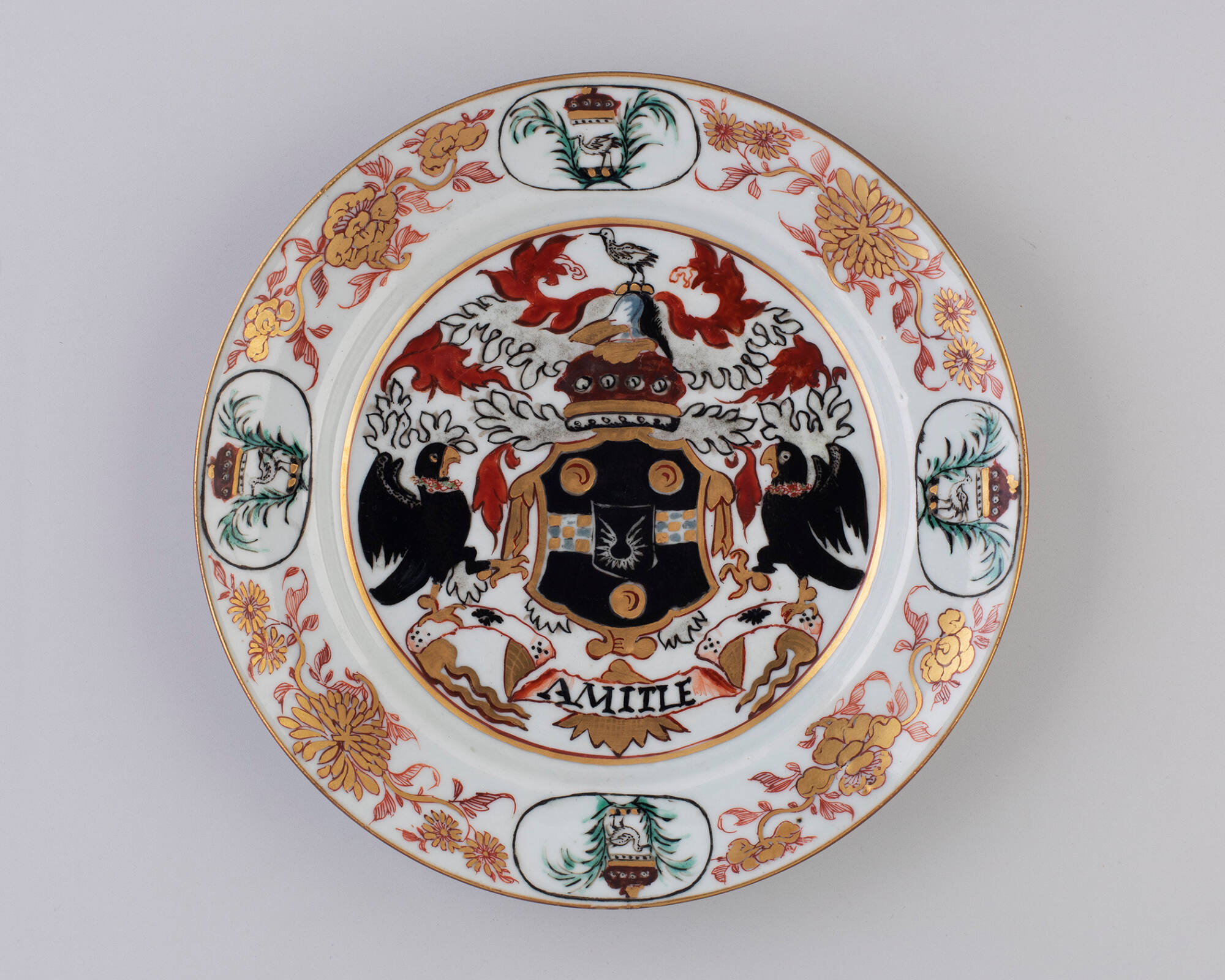 DescriptionCoat of arms of Pitt with motto "Amitie," bird crest and flowering branches in border.