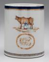 DescriptionEntwined handle, decorated with a woman milking a cow, monogram, blue and gold border.