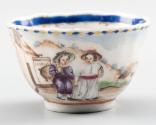DescriptionMiniature size, scene of a boy and girl leaving house with mother in doorway, blue bordering bandings.