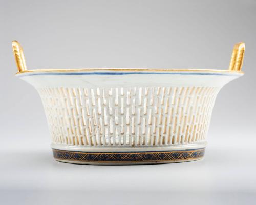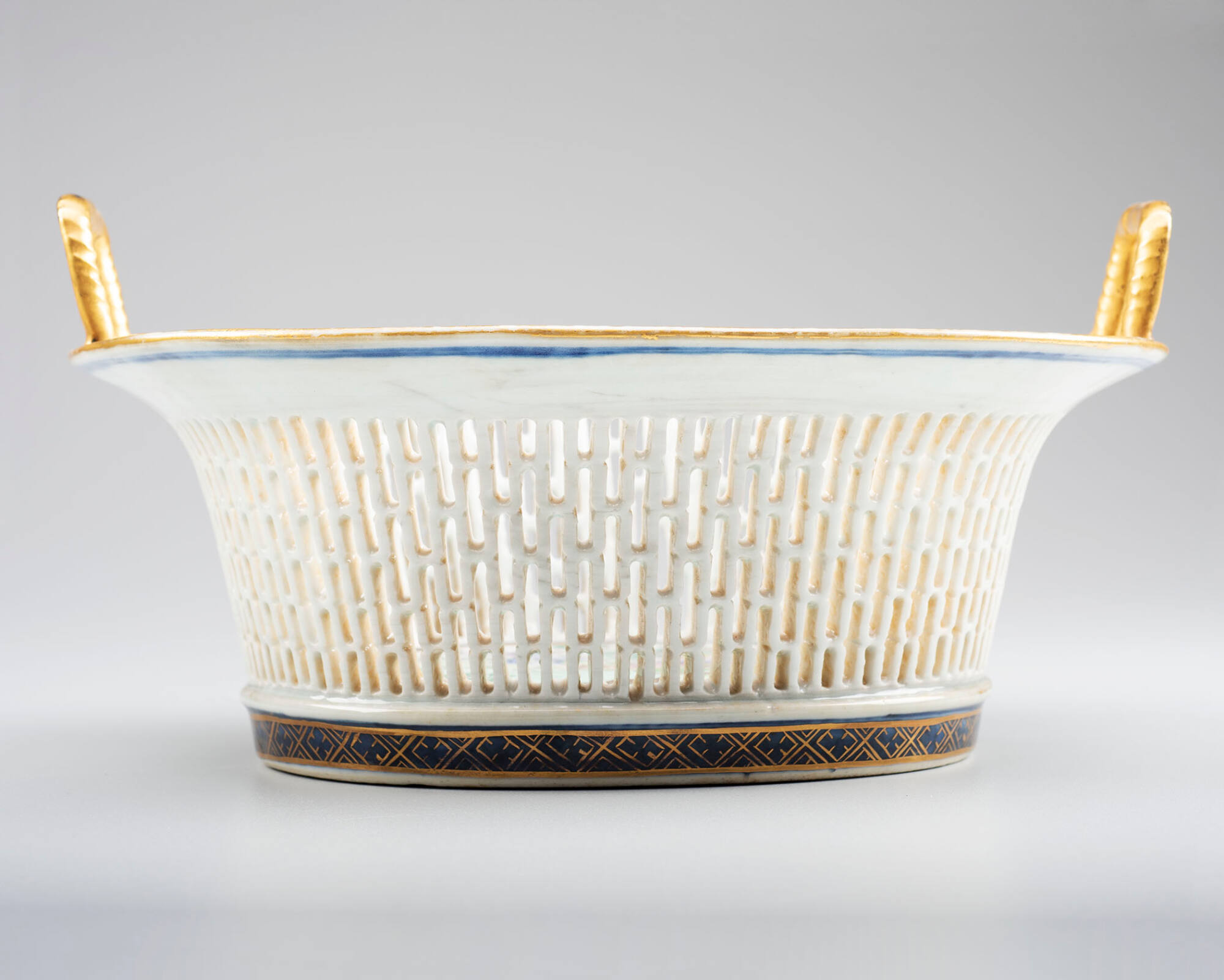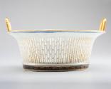 DescriptionGilt loop handles, openwork, blue and gold bandings, interior with Biblical scene.