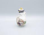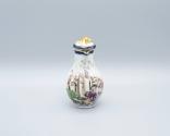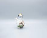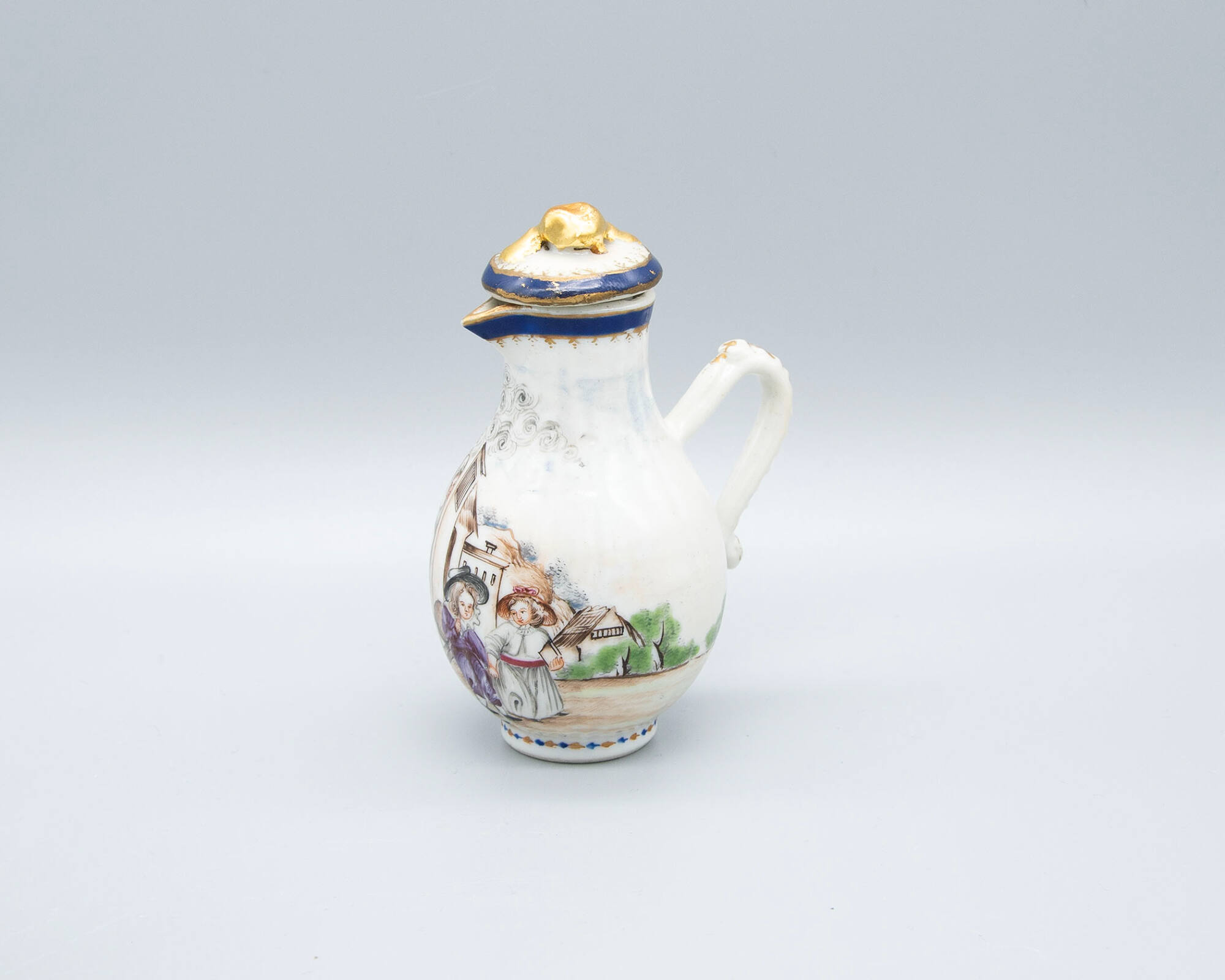 DescriptionMiniature tea service, decorated in colors with a scene of a European boy and girl setting out for school with their mother watching them from the doorway of their house, blue and gold bordering bandings.