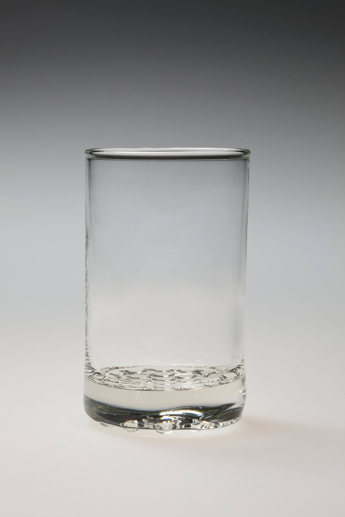 DescriptionMachine-blown colorless glass with straight walls, enforced, beaded edge, and flat base with protruding hob nails.