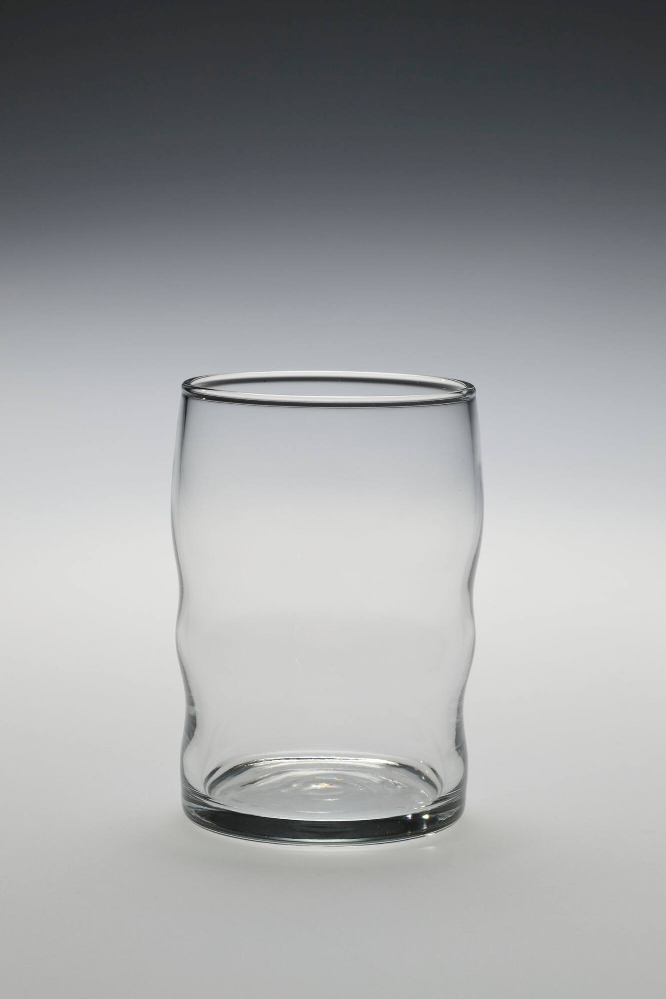 DescriptionMachine-blown colorless glass with a double-bulge shape, enforced, beaded edge, and flat base.