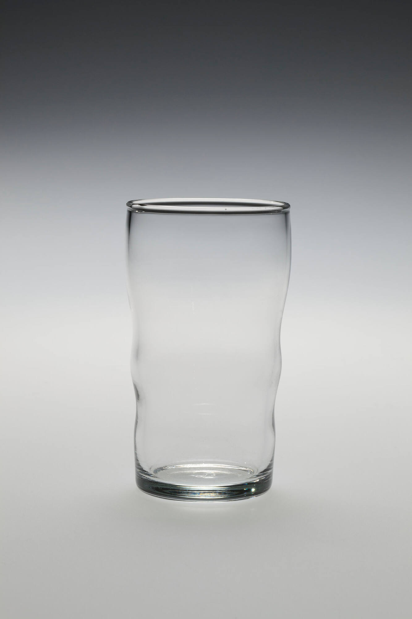DescriptionMachine-blown colorless glass with a double-bulge shape, enforced, beaded edge, and flat base.