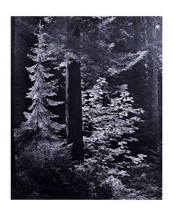 DescriptionBlack and white gelatin-silver print of a redwood forest.