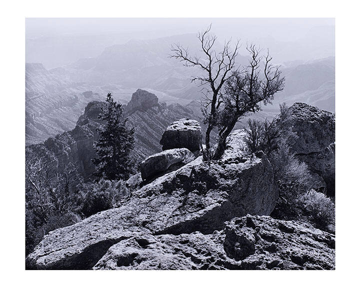 DescriptionBlack and white gelatin-silver print of rock formations surrounding the Grand Canyon.