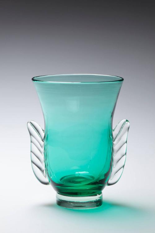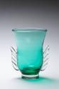 DescriptionSea green vase with crystal foot and applied wing-like crystal elements.