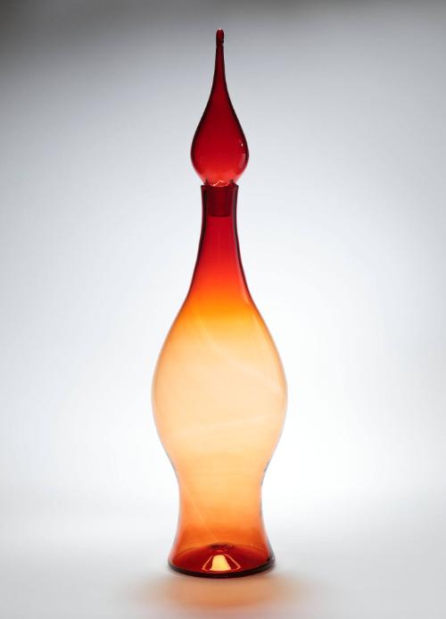 DescriptionThe bulbous body and matching teardrop stopper blown of transparent orange-red glass