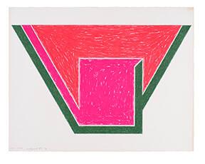 DescriptionThis is a set of 11 lithograph and screenprints of identical size, each one portraying a different “Eccentric Polygon” borrowed from Stella’s earlier “Irregular Polygon” painting series. The polygons generally fill each sheet of paper from top to bottom edge, but they also appear to float against the white fields. Unlike the smooth, brushless surfaces of Stella’s paintings, the color that fills in these shapes is visibly scribbled and striated—in this way making visible the drawing texture typical to the lithography process.