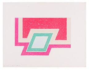 DescriptionThis is a set of 11 lithograph and screenprints of identical size, each one portraying a different “Eccentric Polygon” borrowed from Stella’s earlier “Irregular Polygon” painting series. The polygons generally fill each sheet of paper from top to bottom edge, but they also appear to float against the white fields. Unlike the smooth, brushless surfaces of Stella’s paintings, the color that fills in these shapes is visibly scribbled and striated—in this way making visible the drawing texture typical to the lithography process.