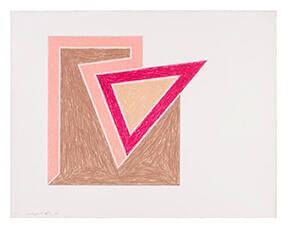 DescriptionThis is a set of 11 lithograph and screenprints of identical size, each one portraying a different “Eccentric Polygon” borrowed from Stella’s earlier “Irregular Polygon” painting series. The polygons generally fill each sheet of paper from top to bottom edge, but they also appear to float against the white fields. Unlike the smooth, brushless surfaces of Stella’s paintings, the color that fills in these shapes is visibly scribbled and striated—in this way making visible the drawing texture typical to the lithography process.
