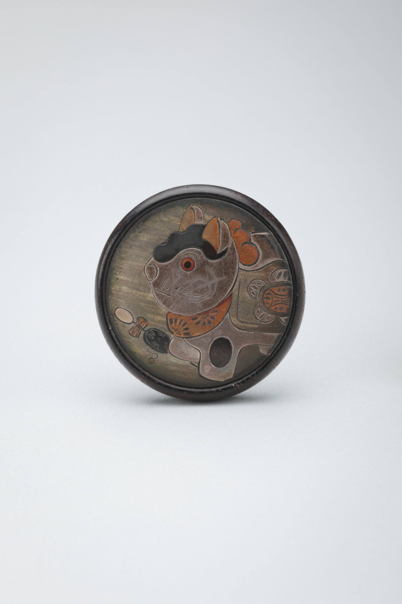 DescriptionSmall kagamibuta (mirror lid) of an inuhariko (good luck dog).