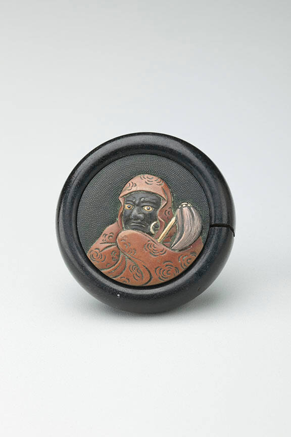 DescriptionKagamibuta (mirror lid) of Daruma, background is all fishrow.