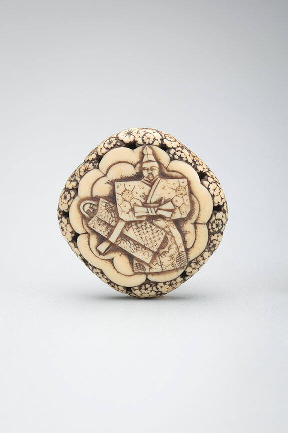 DescriptionTachibana dolls with flowers on backside of the netsuke.