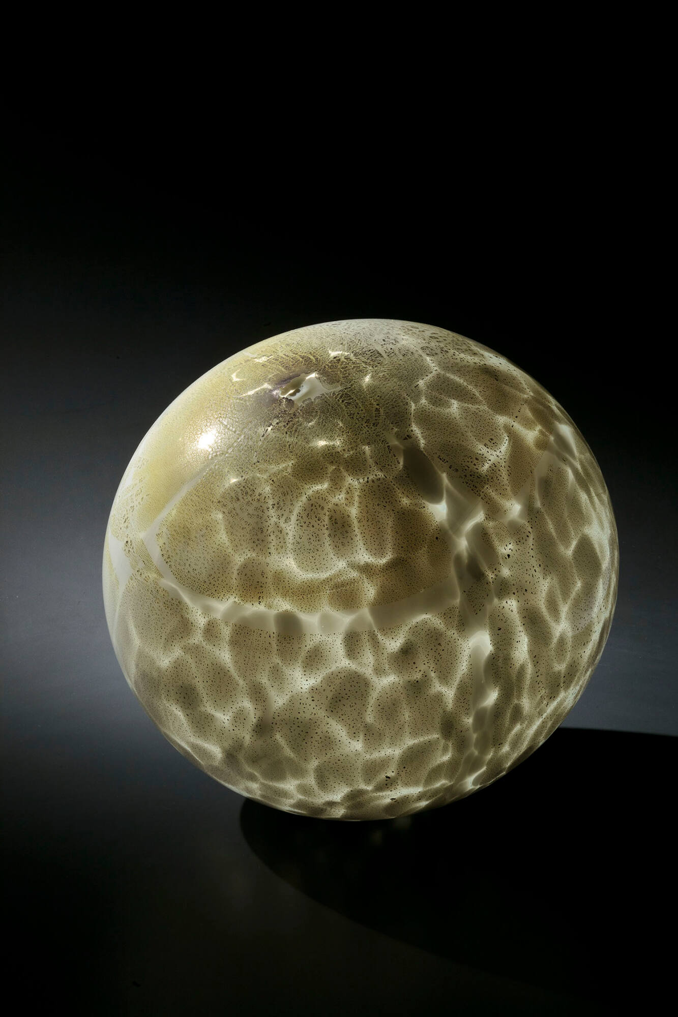 DescriptionBlown colorless glass with opaque white overlay, expanded into a sphere, then decorated with pale yellow glass and sheets of gold leaf that shattered when the bubble was blown into the shape of a large orb.