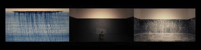 DescriptionIn this installation, three different images—which were shot in the same room—are projected by three projectors. One projection is the various retakes of images of the sea. The other two images are the painting animations, which is expanded onto the room. A sound of an old-school projector and music works on water by Morris Label can also be heard throughout the video