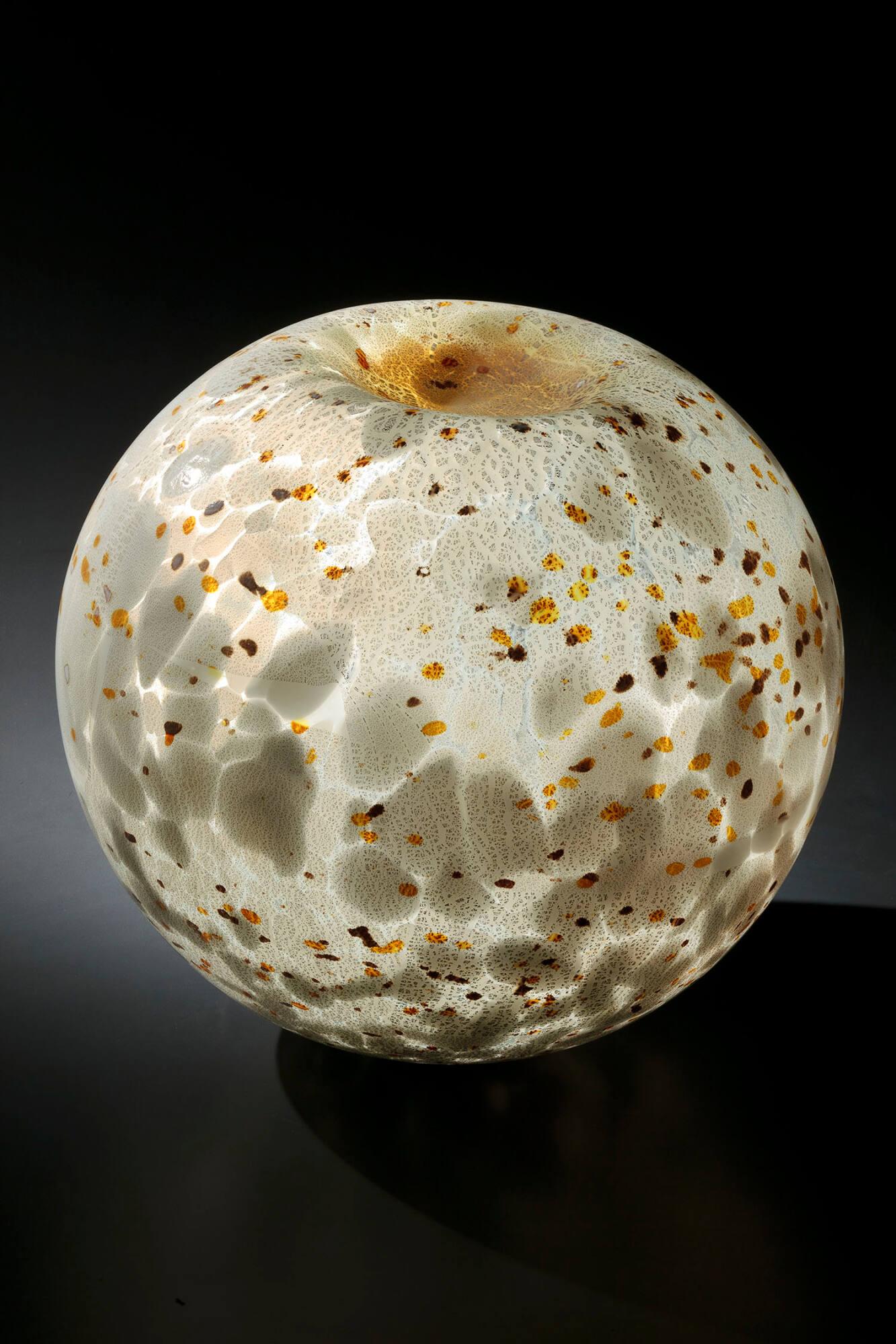 DescriptionBlown colorless glass with opaque white overlay, expanded into a sphere, then decorated with pale yellow glass and sheets of gold leaf that shattered when the bubble was blown into the shape of a large orb.