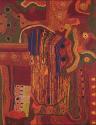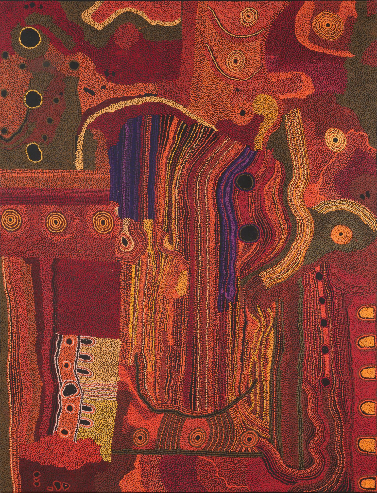 Label TextIn Seven Sisters, Tjungkara Ken employs a rich palette and meticulous dotting composed into sections of parallel lines to suggest an aerial perspective of the patchwork of landforms that compose the vast and changing topography of her ancestral country, the Anangu Pitjantjatjara Lands in South Australia. The subject of the painting is a Dreaming—a story about the creation of the world by ancestral beings—in which the Seven Sisters (the Pleiades star cluster) are forever chased by Nyiru (a star in the Orion constellation), who wants to marry the eldest sister. The sisters travel to Earth to escape Nyiru’s unwanted attention and assume human form. Tjungkara’s painting depicts their journey across the desert. Circles and ovals represent important sites; traveling lines join them to mark the flight of the Seven Sisters. Like many Aboriginal and Torres Strait Islander artists, for Tjungkara her artistic practice is an effort to preserve and communicate her religion and culture. By painting traditional stories on non-traditional materials for non-Aboriginal audiences, Tjungkara navigates the complex territory between embracing a cross-cultural world and protecting herself from being compromised by it.Exhibition HistoryAraluen, NT, Australia, Araluen Arts Centre, Desert Mob 2013, September 6 –October 20, 2013.