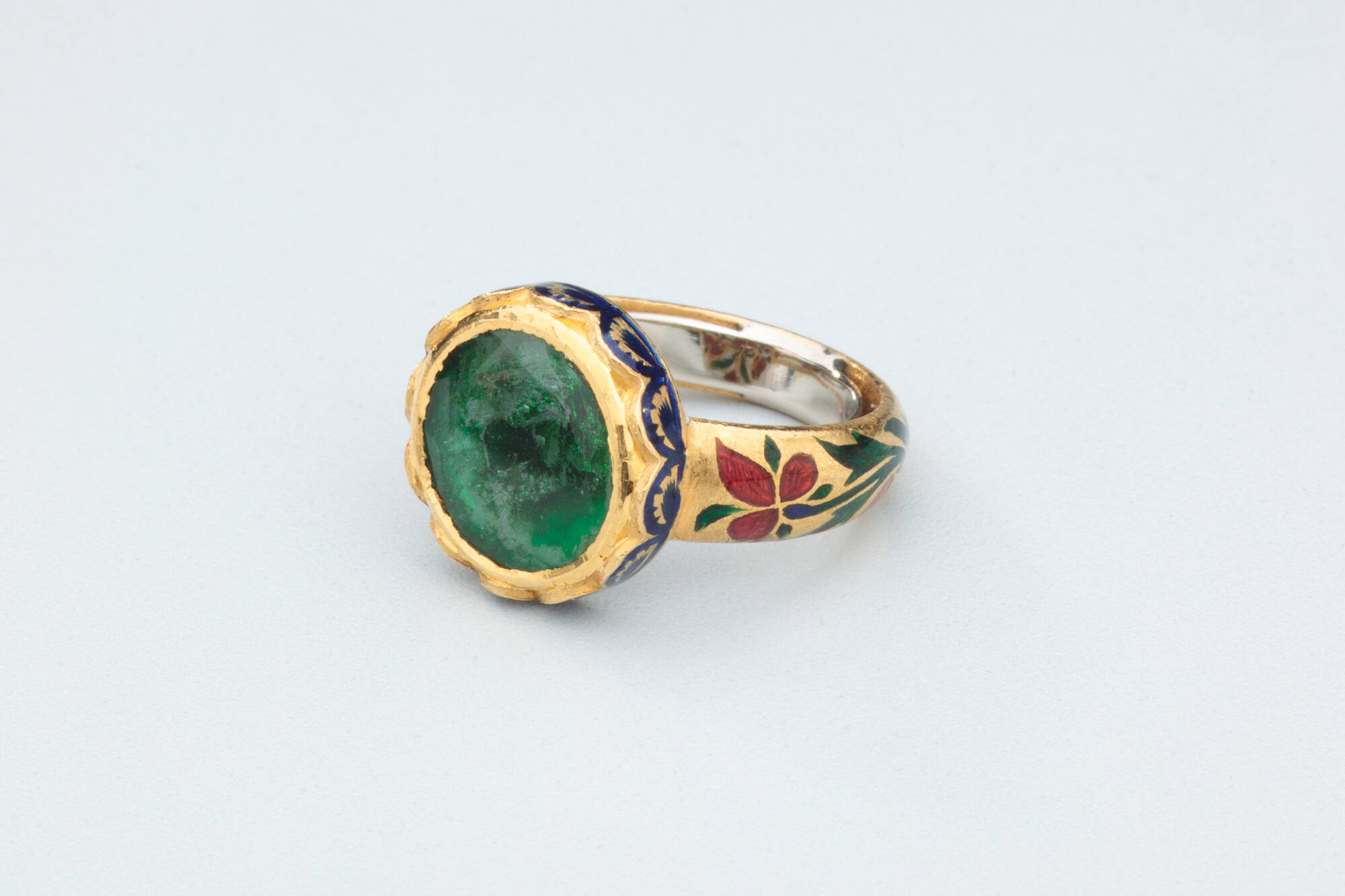 DescriptionLate 19th century 21 karat gold, enamel, 4 karat emerald ring.
