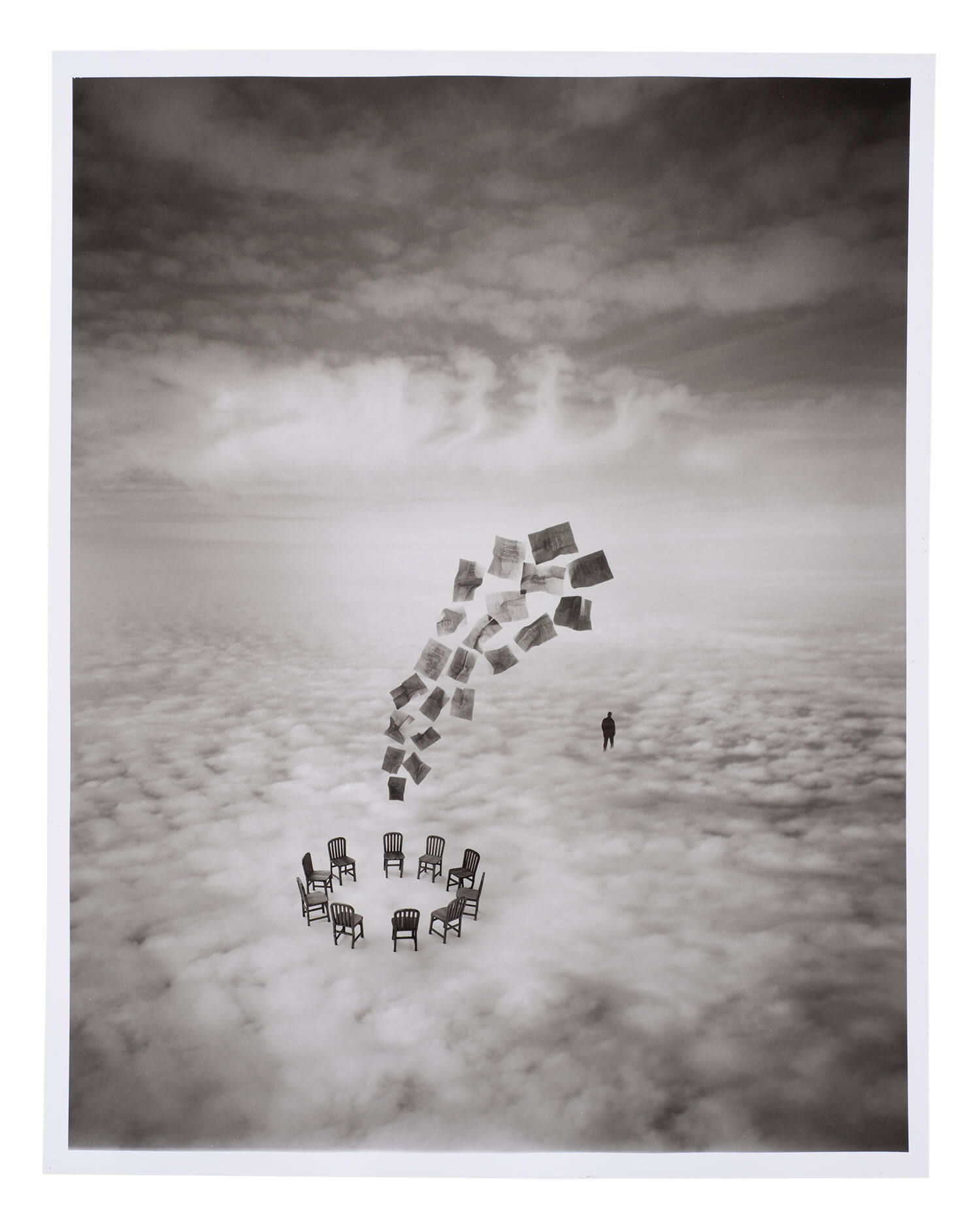 DescriptionComposite photograph of a figure walking in the clouds, and a circle of chairs, above which float a column of papers