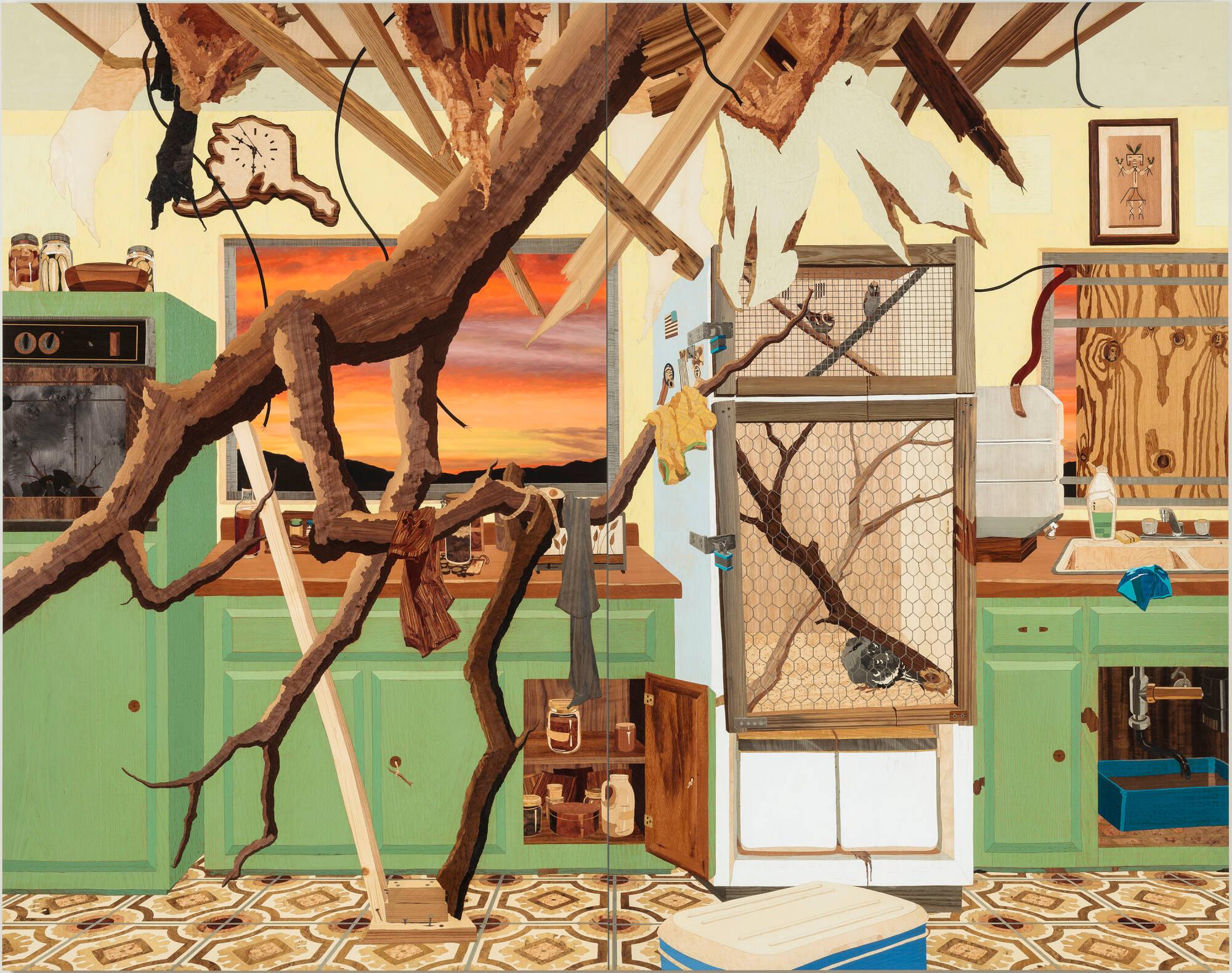 Label TextAt first glance you may assume this work is paint on canvas or board. But look carefully—most of the image is composed of inlayed wood. Alison Taylor has become well-known for reinvigorating the Renaissance craft of marquetry, or intarsia wood inlay, which she combines with painting. Describing this synthesis, Taylor explains, “What interests me is a new type of surface created by the contrast of the textural qualities of the wood and the depth afforded by the paint. I found this tension was just what I needed to convey the otherworldly feeling I encountered in real life when I observed how nature adapts and mutates to accommodate encounters with the ever-encroaching urban environment.” Kitchen is a meditation on the power of adaptation in the aftermath of disaster. The kitchen—once a comforting symbol of hearth and home—is here transformed into a scene of survival: an invasive tree limb, clothes drying on its branches, has collapsed through the ceiling. A useless refrigerator is now a habitat, breeding wild birds (for food?). A cooler becomes a temporary solution for keeping perishables, and the oven houses charcoal for cooking.Published ReferencesAlison Taylor: Savage Root, Nyon, Chateau de Nyon, 2015, repr. (col.) p. [15-16].