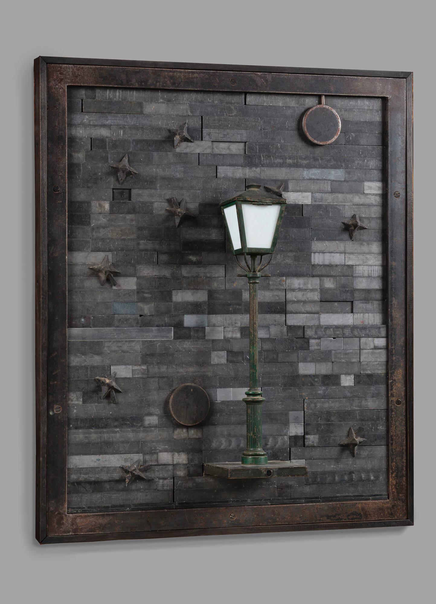DescriptionThe centerpiece of this construction is a 3D depiction of a lamp which extends 5 ¾ inches from the picture plane