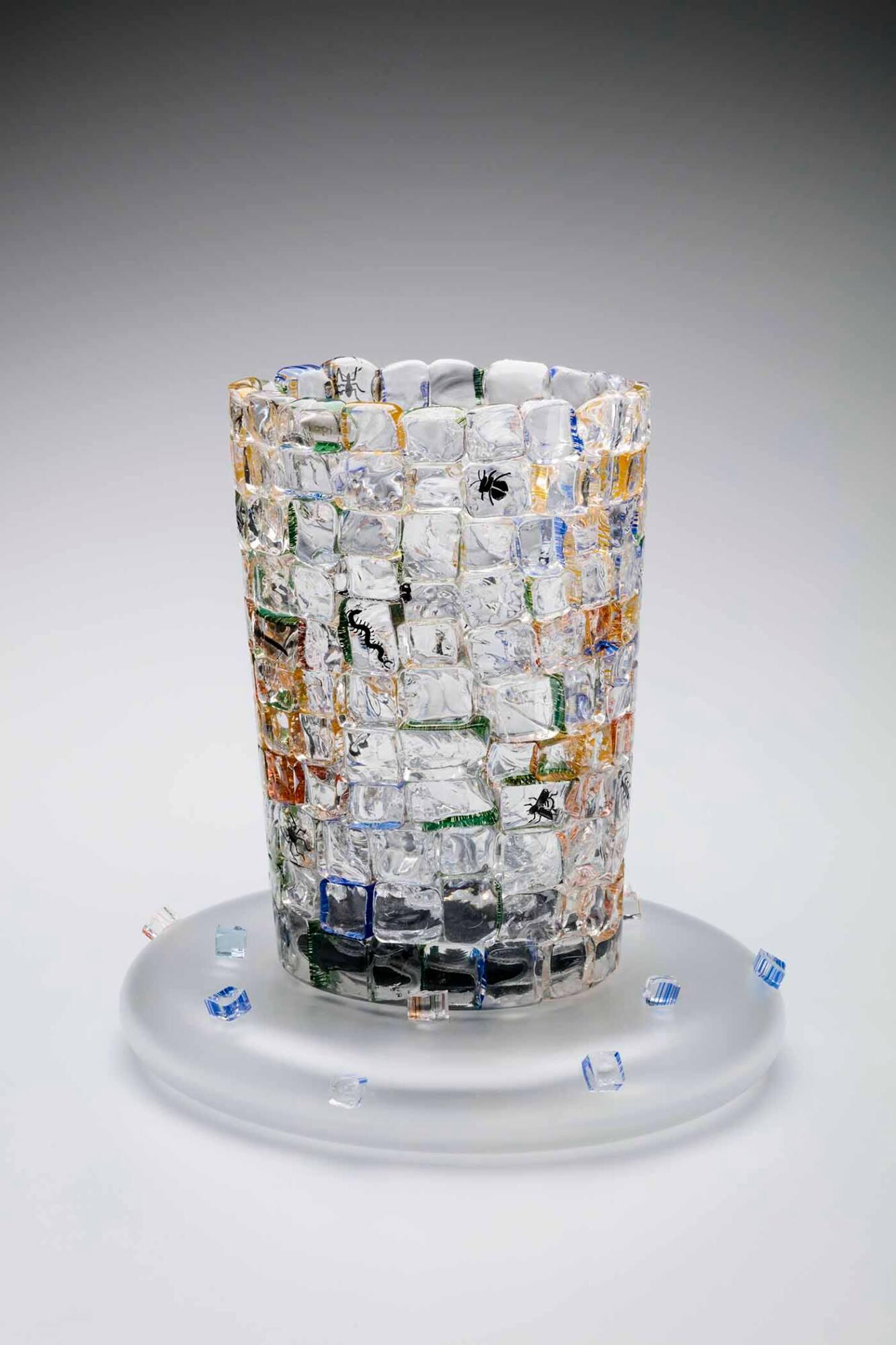 DescriptionThe cylindrical vessel, flaring towards the rim, is constructed of brick-like colorless cane sections with thin edges in primary colors that are loosely fused together. In a random pattern, some of the “bricks” are engraved and enameled with black insects, such as centipedes, ants, beetles, and flies. The tower is fused to a lenticular hollow blown base with a satin-etched surface to which a few “bricks” are randomly fused. An engraved glass frog, a model commercially produced by the Waterford® Crystal factory, has been applied to the interior base of the cylinder.