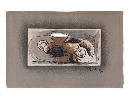 DescriptionLithograph printed on white paper. In the center, a very bulbous teapot with a large conical mouth and protruding spout is depicted in crude outline and filled in with patches of dark brown. To the right, a banana and the outline of an apple. A gray background fills the space around the objects and trails off into the white paper at the edges.