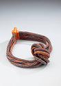 DescriptionNeckpiece, consisting of five strands of grey and orange antique glass beads. The beads have been arranged into geometric patterns including stripes, zig zags and squares and are hand knotted with silk. The ends of each strand are fitted to a clasp formed of two interlocking U-shapes, carved from DuPont™ Corian® in Mandarin and secured by a pair of rare-earth magnets embedded in each section. The neckpiece can be tied into an ornamental knot at the front.