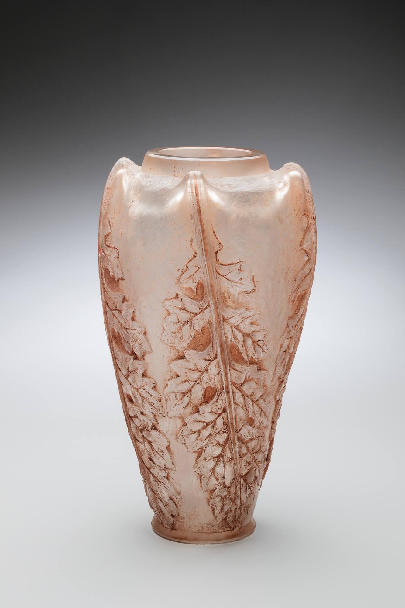 DescriptionMold-blown colorless glass using a cire perdue (lost wax) mold, etched, polished base, light brown patina. The tall, cast glass vase consists of a body of inverted baluster shape that tapers from the shoulders toward the base, the short, slightly inverted rim with a straight edge. Its surface is modeled with four vertical, upside-down fern leaves, their ribs creating four protrusions at the vessel shoulder. The body’s surface is acid-etched and the leaves are emphasized with an applied brown patina. The pontil mark beneath the slightly flared base is ground out to a shallow, concave circle.