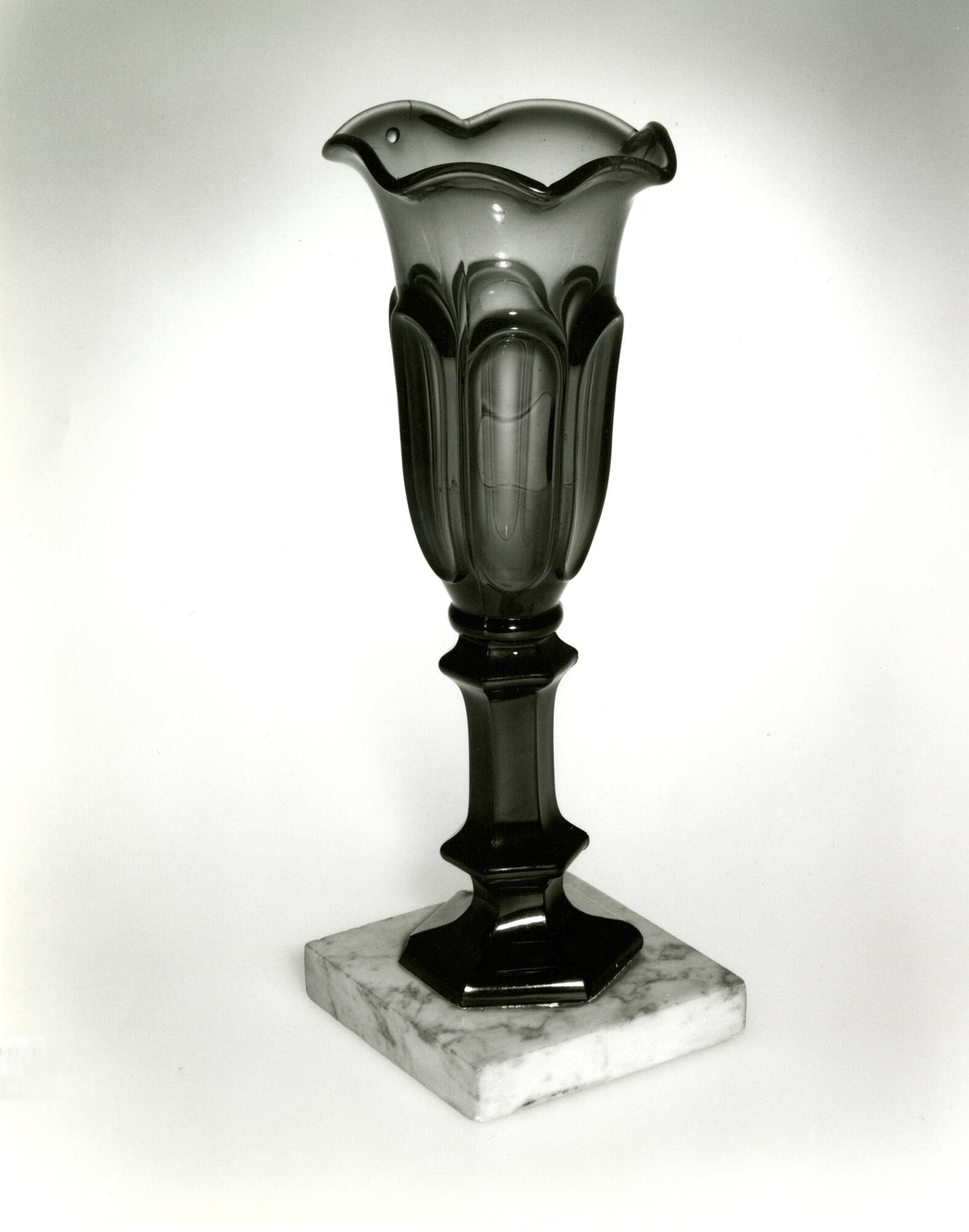 DescriptionPressed in the same manner and in the same type of mold as 1964.40 and perhaps in the same mold as 1965.158 modified to omit the bottom step. Mounted on a marble base.