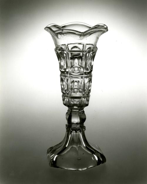 DescriptionEntire piece pressed upright in a female mold of three vertical sections, each section bearing two vertical rows of the block-and-printie pattern, by a plain male plunger that formed the hollow interior of the bowl, in conjunction with a plain male plunger, or plug, that formed the hollow interior of the base. The moldmarks extend from the underside of the foot to the rim. Rim reheated, tooled, and crimped to form the gauffered rim. No pontil mark. Underside of base ground and polished.