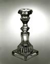 DescriptionHexagonal socket and stem pressed upright in a female mold of two vertical sections by a plain male plunger. Joined by a wafer to an octagonal standard on a square plinth. Standard and plinth pressed upside down in a female mold of two vertical sections in the same manner as that used for 1967.106. Same rough pontil mark as that on 1967.106. Base not ground. Socket highly fire-polished.