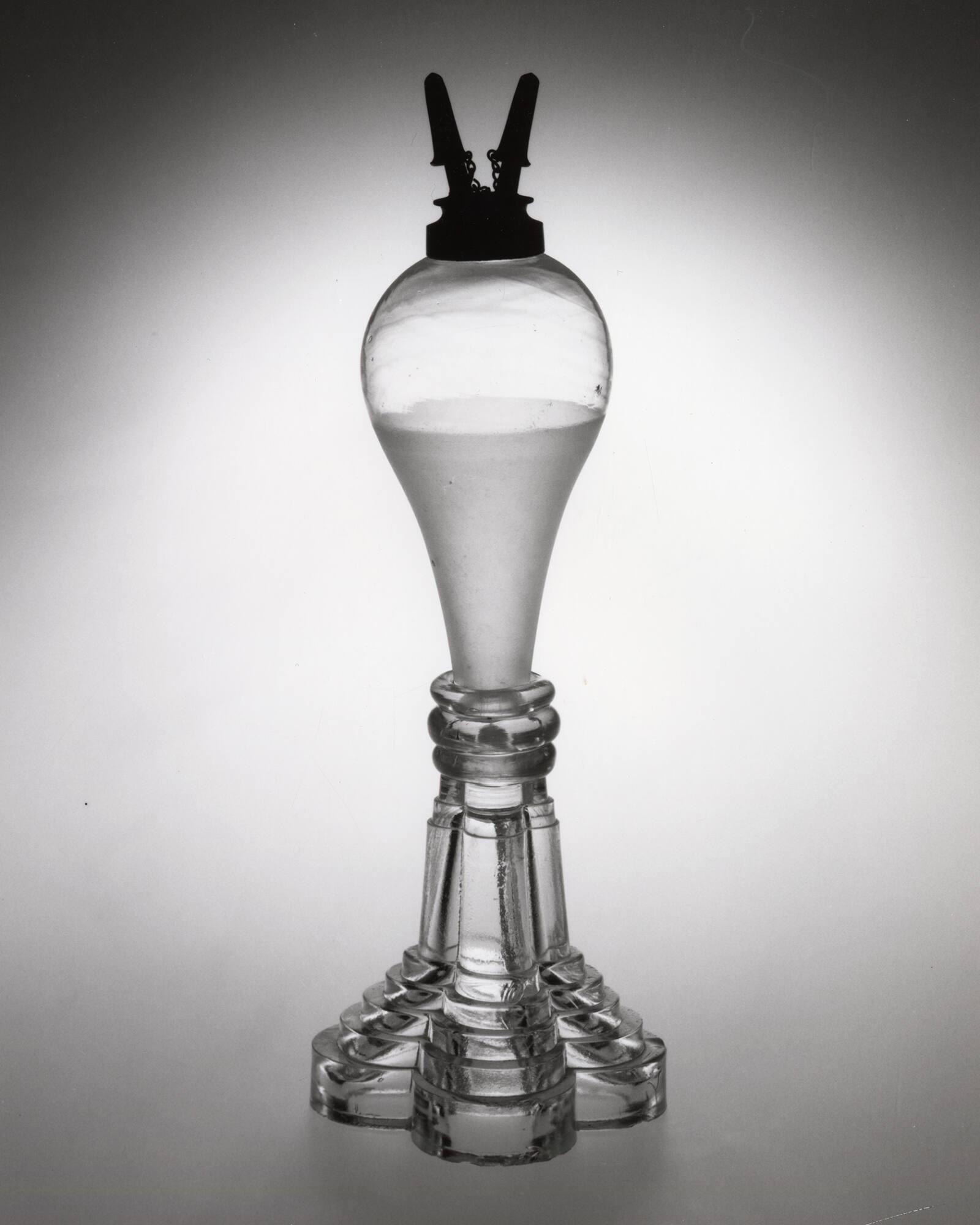 DescriptionBulb font blown and finished by tooling. Joined by three heavy wafers to a standard and base. Standard and base pressed in the same mold and in the same manner as 1967.100. Rough pontil mark on interior of base opposite second step. The lower part of the font roughed. Pewter collar machined and threaded, with double-wick brass-and-pewter burner for burning fluid and brass chain and two caps attached.